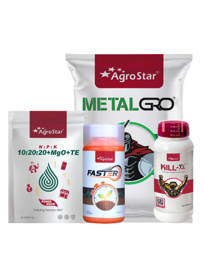किल एक्स - ८० मिली / एकर, मेटल ग्रो - ४०० ग्रॅम / एकर, एनपीके १०:२०:२० - १ किलो / एकर, फास्टर- ५०० मिली / एकर,